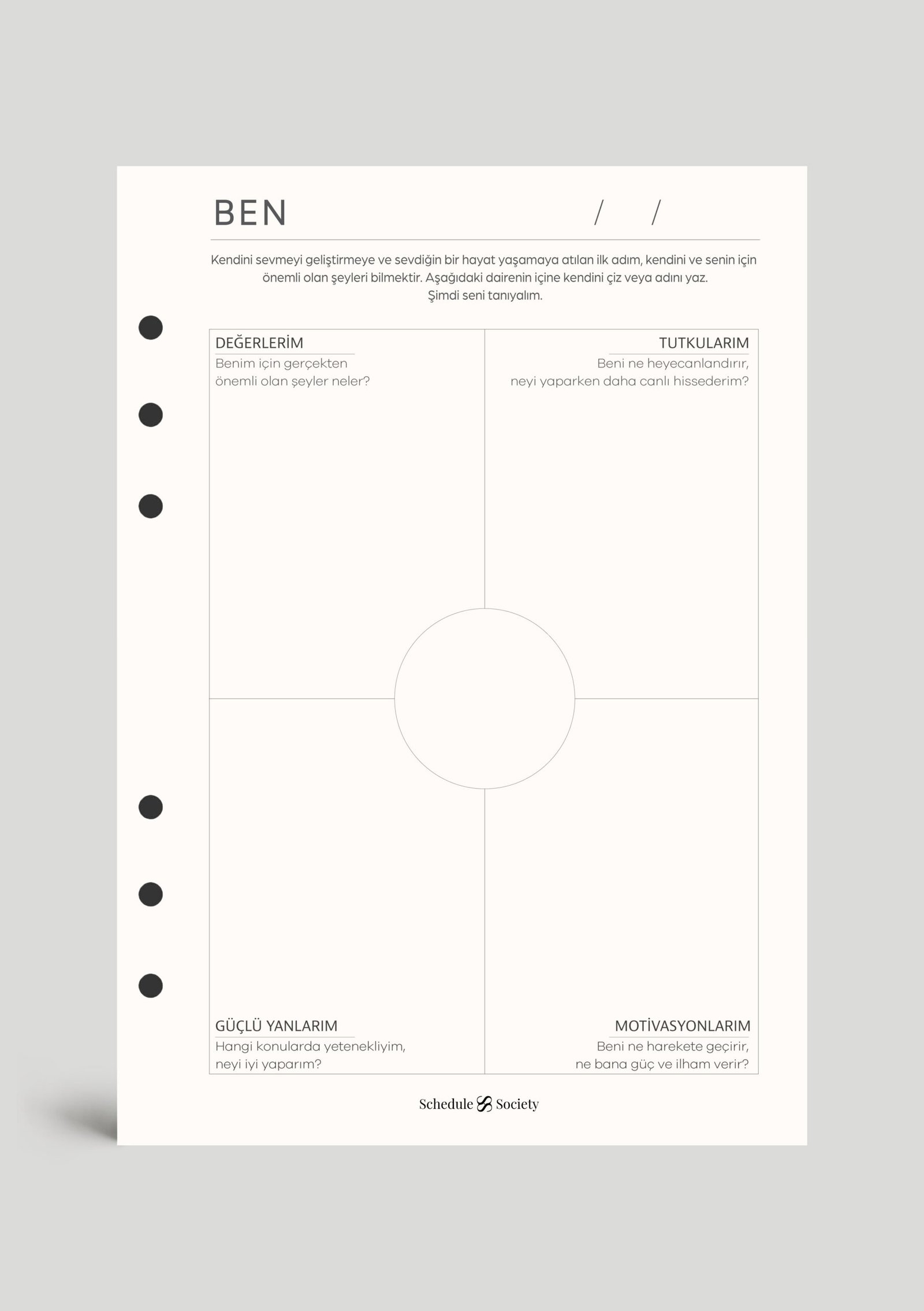 Kendini sevmek ve sevdiğin bir hayatı yaşamak, her şeyden önce kendini tanımaktan geçer. Ben sayfası, sahip olduğunuz değerleri ve sizi hayata bağlayan tutkuları Schedule Society’nin modern lüks çizgileriyle analiz etmeniz için tasarlandı. Bu özel planlama sayfası, karakterinizin temel taşlarını kusursuz bir düzende kurgulamanızı sağlar. Özellikle dört ana odak alanı sayesinde iç dünyanızda anında görsel bir netlik yaratır. Bu nedenle güçlü yanlarınızı not ederken kendinizi çok daha öz güvenli ve profesyonel hissedersiniz. Öz farkındalık yolculuğunuzda bu karizmatik tasarım size her an eşlik eder.