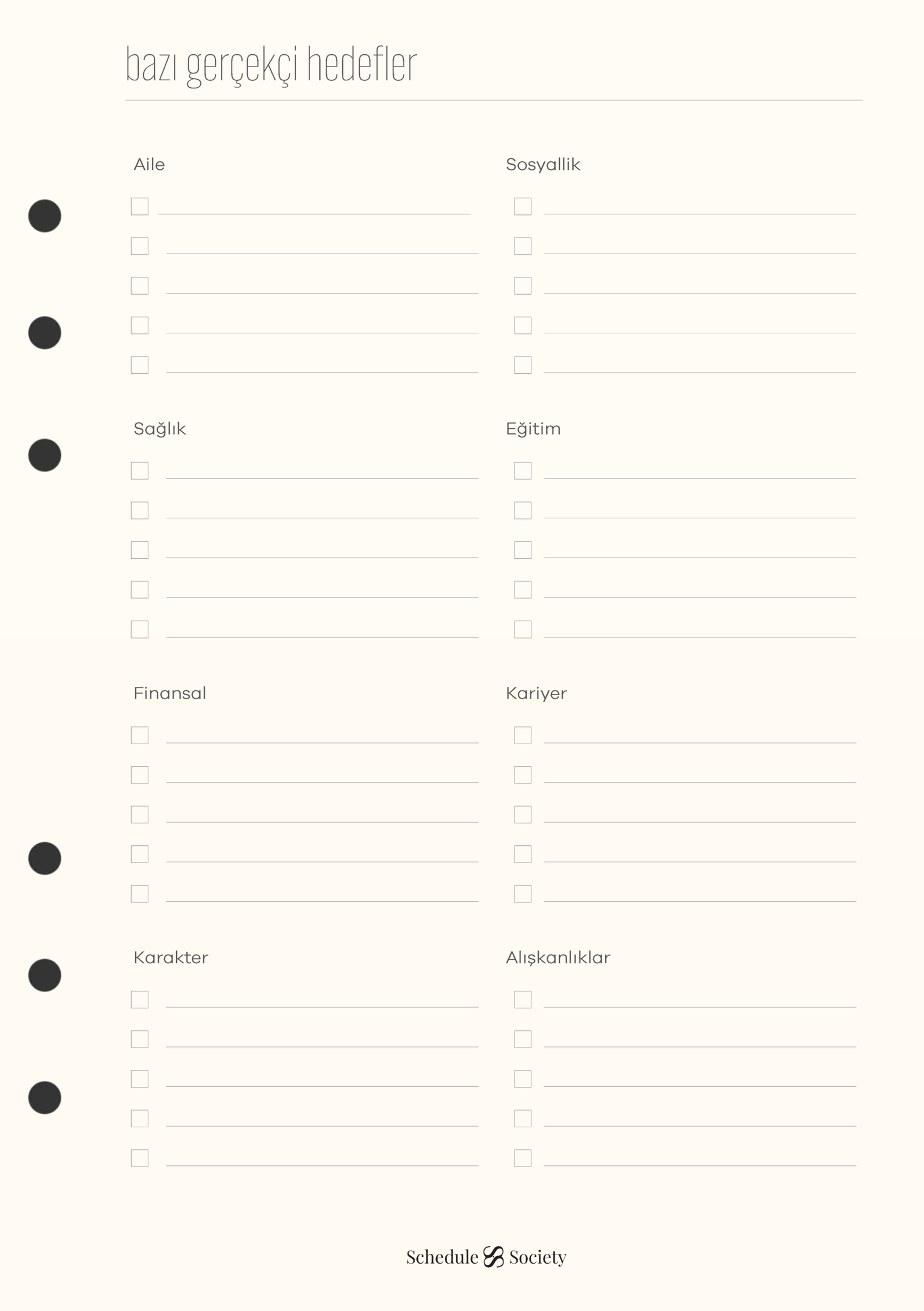 Büyük başarılara giden yol her zaman net ve yazılı hedeflerden geçer. Hedefler sayfası, vizyoner hayallerinizi ve stratejik adımlarınızı Schedule Society’nin modern lüks çizgileriyle yönetmeniz için tasarlandı. Bu özel planlama sayfası, tüm beklentilerinizi kusursuz bir düzende kontrol etmenizi sağlar. Özellikle odaklı tasarım bölümleri sayesinde hedeflerinizde anında görsel bir netlik yaratır. Bu nedenle her yeni başarıyı not ederken kendinizi çok daha kararlı ve profesyonel hissedersiniz. Kariyerinizdeki zirve noktalarına giden yolda bu karizmatik tasarım size her an eşlik eder.