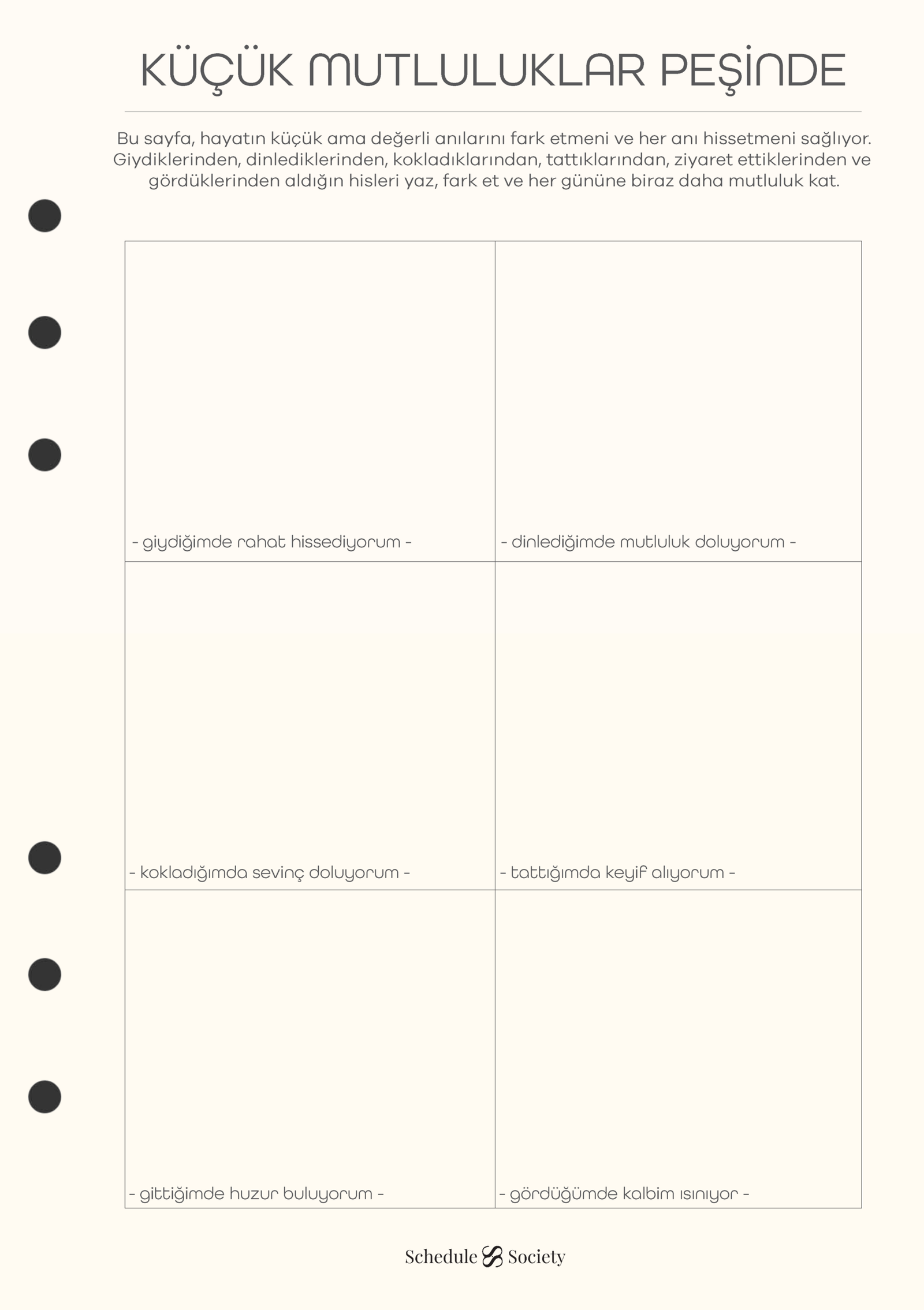 Gerçek huzur, günlük hayatın içinde saklı olan o küçük ama değerli detaylarda gizlidir. Küçük Mutluluklar sayfası, sizi gülümseten anları ve şükran duyduğunuz olayları Schedule Society’nin modern lüks çizgileriyle not etmeniz için tasarlandı. Bu özel planlama sayfası, tüm anılarınızı kusursuz bir düzende saklamanızı sağlar. Özellikle ferah not alanları sayesinde ajandanızda anında pozitif bir netlik yaratır. Bu nedenle her yeni mutluluğu not ederken kendinizi çok daha huzurlu ve profesyonel hissedersiniz. En güzel anılarınıza giden yolda bu karizmatik tasarım size her an eşlik eder.
